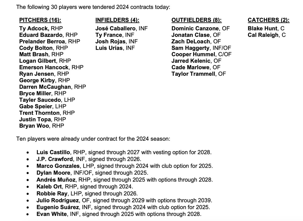 Ryan Divish on X: “The Mariners tendered 2024 contracts to the 30